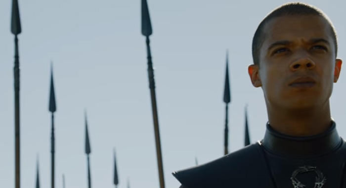 2. Grey Worm’s stern face appears with a storm of spears puncturing the air behind him. No surprises there.