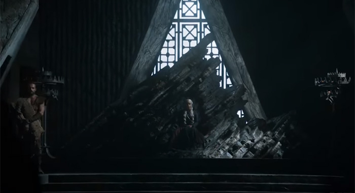 22. Daenerys sits on the Dragonstone throne with a Dothraki guard.