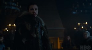 26. A chorus hails, “The King in the North!” We’re in the great room at Winterfell. You can see the fireplace in front of which Bran Stark had long ago heard the pleas of the Stark family vassals and Ramsay Bolton later killed his father. Roll call: Jon Snow? Check. Sansa? Present. Brienne of Tarth? Here! Who’s that on the left? Messed up face guy? We were hoping it was Tormund Giantsbane, but maybe it’s a Karstark?