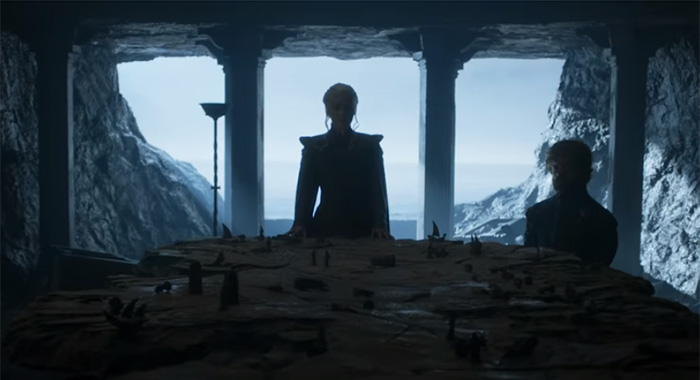 42. “….on the Iron Throne.” Truth, Davos! Truth! Here we see the silhouettes of Daenerys and Tyrion in the Dragonstone map room. Them thinking: What do we conquer second?