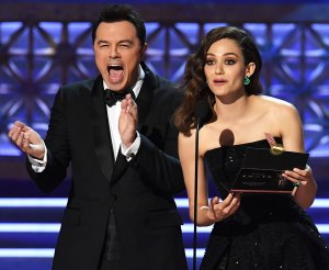Award presenters Seth MacFarlane (L) and Emmy Rossum