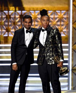 Actor-writers Aziz Ansari (L) and Lena Waithe accept Outstanding Writing for a Comedy Series for Master of None.