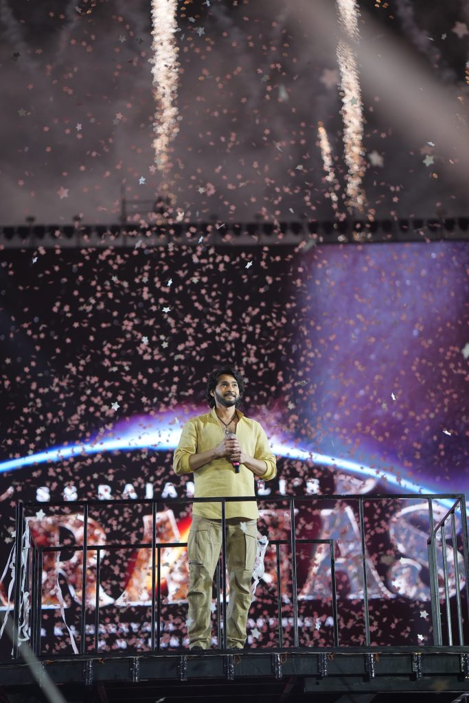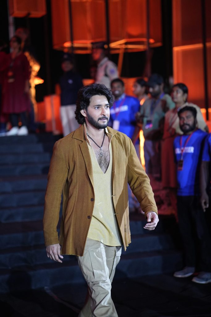 Getting to the venue at Ramoji Film City felt like stepping into a movie before the movie had even begun. Our journey veered off-road, kicking up dust as we made our way toward a glowing neon sign announcing the film city in the distance. Once inside, the scale of it all became immediately clear. The event space was designed like a living, breathing city, bathed in warm oranges and yellows, anchored by one of the largest LED screens in the world: a staggering 100 by 132 feet. Overhead, drone cameras zipped through the air as the crowd erupted into thunderous chants of “Jai Babu!”