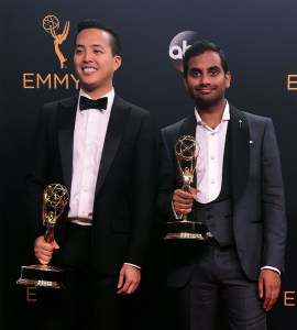 Writer-producer Alan Yang and actor-comedian Aziz Ansari pose with the Emmy for Outstanding Writing for a Comedy Series for Master of None