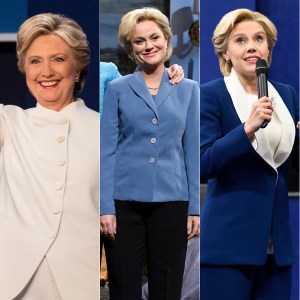 Democratic presidential nominee Hillary Clinton; SNL cast members Amy Poehler and Kate McKinnon