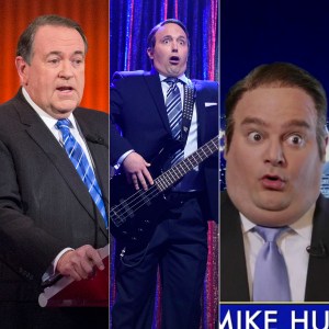 2016 Republican presidential candidate Mike Huckabee; SNL cast members Beck Bennett and Bobby Moynihan